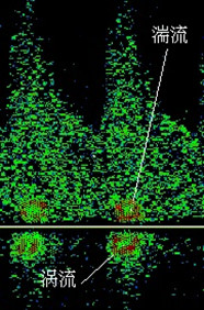 4)湍流:在病理情況下出現。頻窗內出現的一小團高頻信號稱為湍流(如血管狹窄時的射血,心臟關閉不全時的返流)。湍流所顯示是頻譜增寬、光點疏散、頻譜包絡線毛糙的圖形,“頻窗”消失,多普勒輸出可聽到嘈雜刺耳的血流聲。
