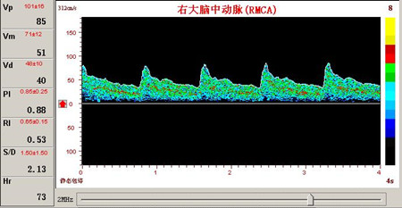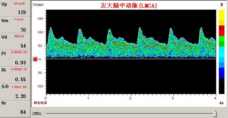 超聲經(jīng)顱多普勒血流分析儀大腦中動(dòng)脈血流速度不對(duì)稱頻譜圖