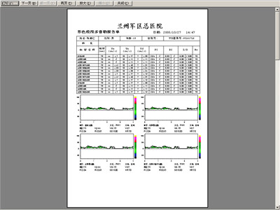 本界面有快速檢索功能。如果存貯的病歷(超聲經顱多普勒血流分析儀報告)很多(如幾千份),可通過輸入病人的姓名、編號、日期三項中的一項或幾項后,點擊檢索,即可快速選中并顯示該病人的信息;本界面還有頻譜圖顯示和回放功能,如在超聲經顱多普勒血流分析儀檢測時保存了動態數據,則在查看以前保存的超聲經顱多普勒血流分析儀報告時,可回放當時檢測的血管血流頻譜的全過程(有聲電影),如只保存了靜態數據,則只顯示靜態頻譜圖像;如在報告設置時對典型病例做了標識,則在查詢時可方便地看到做了標識的典型病例。